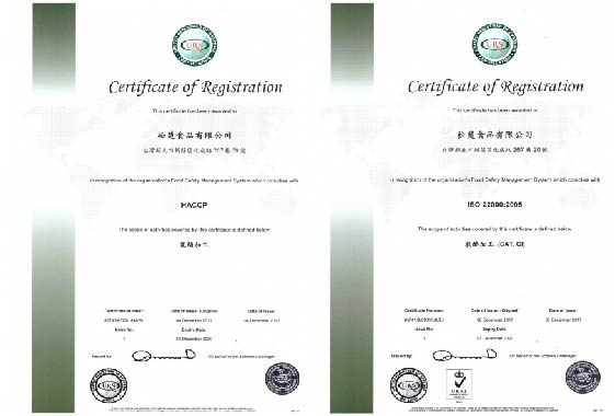 通過國際系統 ISO22000 及 HACCP 驗證及執行, 提供客戶最安心之產品品保標準